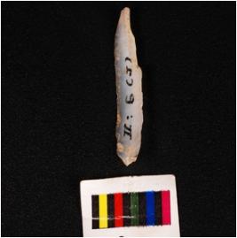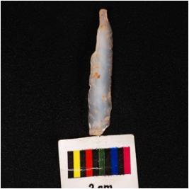 | Description / विवरण | A point made of chalcedony with a mid-ridge on the dorsal prepared platform prominent bulb, use-wear marks on cutting edges, broken at proximal end and triangular in section. |