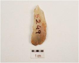 | Description / विवरण | Chalcedony blade with two ridges on dorsal side, striking platform, partly broken along distal end, use wear marks on cutting edges, trapezoidal in section and raw material given heat treatment. |