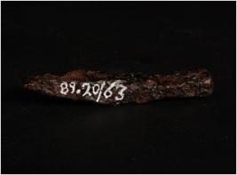| Description / विवरण | Fragment of iron nail, squar in section, head broken, thick end. Rusted and chemically treated. |