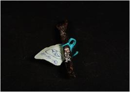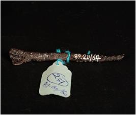 | Description / विवरण | Fragment of rusted iron nail with square section. Flat broad head. Rusted and chemically treated. |