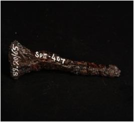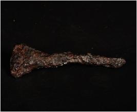 | Description / विवरण | Fragment iron nail with square section. Flat broad head. Rusted and chemically treated. |