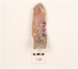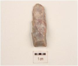 | Description / विवरण | A flake made on chert, uneven in shape, irregular surface, diffused bulb on ventral side and use-wear marks on edges. |