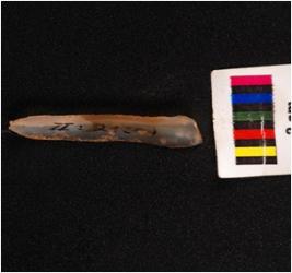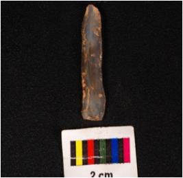 | Description / विवरण | A parallel sided blade, made of chalcedony with a mid-ridge on the dorsal prepared platform, prominent bulb on the ventral and use-ware marks on cutting edges and triangular in section. |