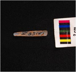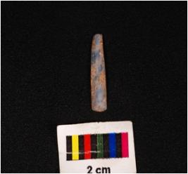 | Description / विवरण | A tiny parallel sided blade of chalcedony with a mid-ridge on the dorsal use-ware marks on the cutting edges and triangular in section. |
