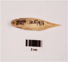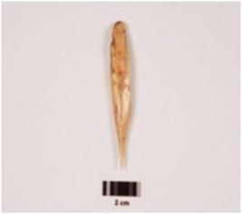| Description / विवरण | Fragment of pointed arrow head bone, plano convex in section, polished both sides and smooth surface. |