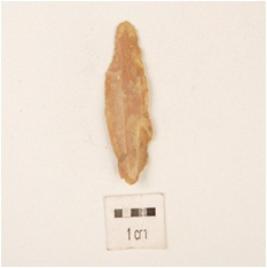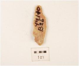 | Description / विवरण | Fragment of chert blade ridges on dorsal side and use wear marks. |