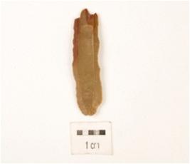 | Description / विवरण | A blade made on chert, two ridge on dorsal side triangular section and use wear marks. |