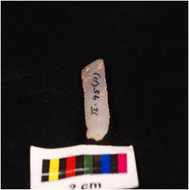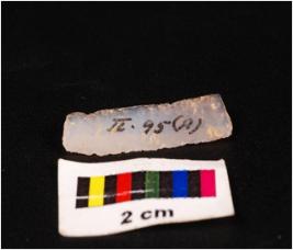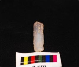| Description / विवरण | Parallel sided blade of chalcedony with double ridge on dorsal trapezoidal section and use-wear marks on the cutting edges. |