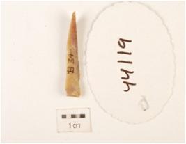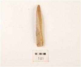 | Description / विवरण | Fragment of chert blade triangular section, ridge on dorsal use-wear marks, prepared platform and bulb is diffussed. |