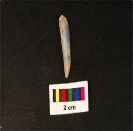 | Description / विवरण | A microlithic point with a mid ridge on dorsal , prepared platform, diffused bulb on ventral , usewear marks on cutting edge, triangular in section and pointed at distal end. |