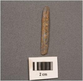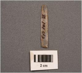| Description / विवरण | A parallel sided blade with two ridges on dorsal , use-wear marks on cutting edges, diffused bulb on ventral and trapezoidal section. |