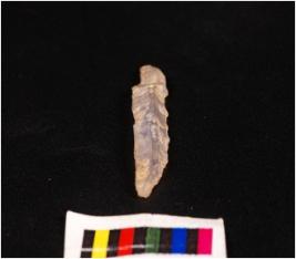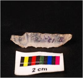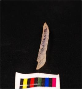 | Description / विवरण | Parallel sided blade of chalcedony with a single ridge on dorsal triangular section and use-wear marks on the cutting edges. |