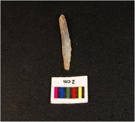 | Description / विवरण | Parallel sided blade with double mid ridge on dorsal side, trapezoidal in section, diffused bulb on ventral, broken at distal end and use wear mark along the cutting edges. |