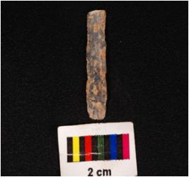 | Description / विवरण | A parallel sided blade of chalcedony with two ridge on the dorsal use-ware marks on cutting edges and triangular in section. |