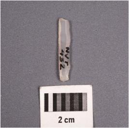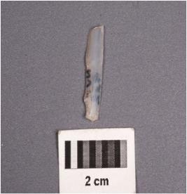 | Description / विवरण | A chalcedony blade with two ridges on dorsal surface, trapezoidal section, diffused bulb on ventral surface, distal end broken and use-wear marks along the cutting edges. |