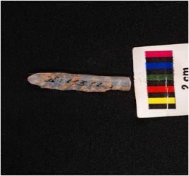 | Description / विवरण | A parallel sided blade of chalcedony with mid-ridge on the dorsal side use-ware marks on cutting edges, prominent bulb on ventral side and triangular in section. |