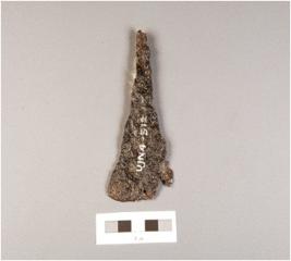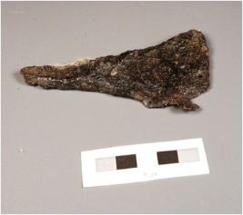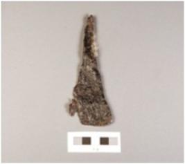 | Description / विवरण | Chisel with a borad working edge slightly broken on one end of working edge, corroded surface. |