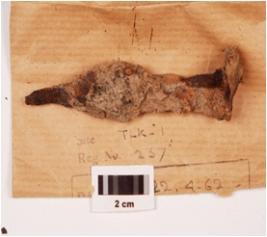 | Description / विवरण | An iron nail, head is broken, uneven surface and rusted. |