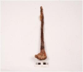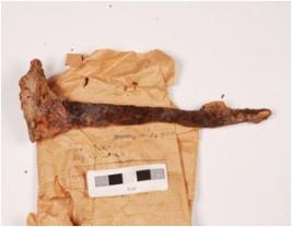 | Description / विवरण | An iron nail, rectangular head, pointed tip, square in section chipped off, rough and rusted surface. |