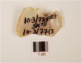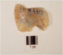 | Description / विवरण | A chalcedony end struck utilized flake, prepared platform, triangular in cross section, use-wear marks along the cutting edge with prominent bulb on ventral side. |