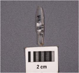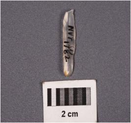 | Description / विवरण | Fragment of a parallel shaped blade with a ridge on dorsal surface, diffused bulb ventral surface, prepared platform partly broken distal end, use-wear marks along cutting edges. |