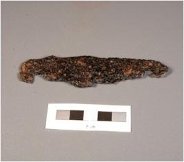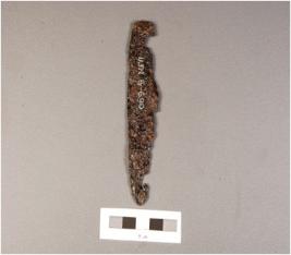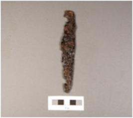 | Description / विवरण | A knife without a handle partly broken on one edge. Corroded surface. |