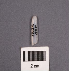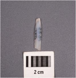 | Description / विवरण | A chalcedony blade with two mid-ridges on dorsal surface, trapezoidal section, diffused bulb on ventral surface, distal end broken and use-wear marks along the cutting edges. |