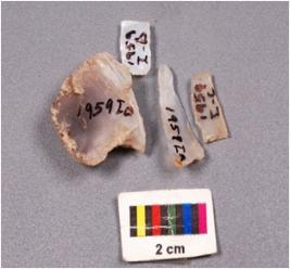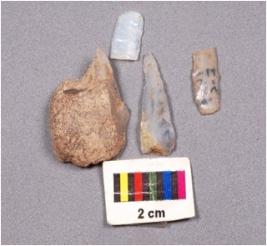 | Description / विवरण | 1 Fragments of two blades and one intact blade of chalcedony detached from prepared from prepared core, use-wear marks along the cutting edges. 2 A borer made on a chalcedony flake, cortex on dorsal side and diffused bulb on ventral side, use-wear makrs along cutting edges. |