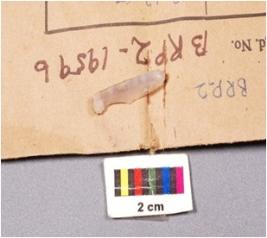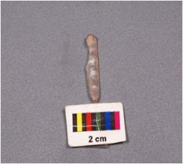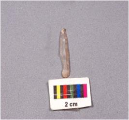 | Description / विवरण | A blade with a mid-ridge on dorsal side, triangular in section, diffused bulb on ventral side and use-wear marks along the cutting edges. |