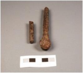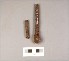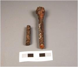 | Description / विवरण | Two broken pieces of one nail. Shaft and expanded triangular head. Crooded surface. |