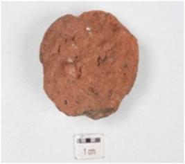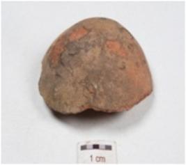 | Description / विवरण | A fragment of terracotta sling ball, rough and slightly chipped off surface, well baked and surface was treated with slip in red colour. |