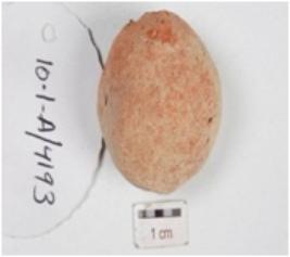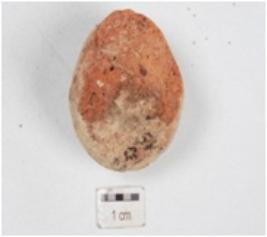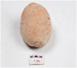 | Description / विवरण | A handmade terracotta ball, slightly chipped off from one side, round top, rough surface and surface was treated with slip in red colour. |