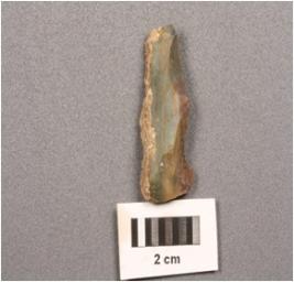 | Description / विवरण | Parallel sided blade made on chert with a single mid ridge, prepared platform, used layer marks on cutting edges, diffused bulb. |