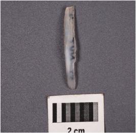 | Description / विवरण | A parallel sided microlithic blade of chalcedony with a prominent ridge on the dorsal surface and use-ware marks on cutting edges, broken at distal end. Trapezoidal in section. |