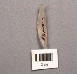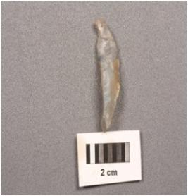 | Description / विवरण | Chalcedony parallel sided blade with one side blunt, blade scars. |