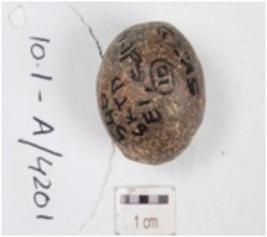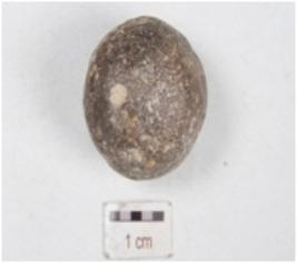| Description / विवरण | A ball made of stone, round in shape, rough surface and slightly chipped off. |