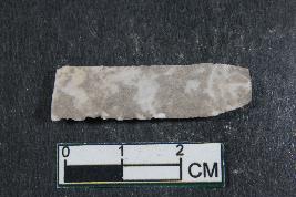 | Description / विवरण | A fragment of blade having two dorsal ridges, bulb of percussion on ventral side and smooth surface. |