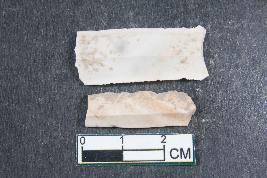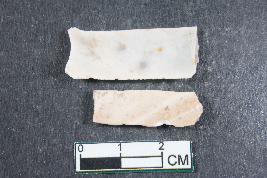 | Description / विवरण | Fragments of blades with two dorsal ridges having smooth surface. Shorter fragment has length equivalent to 2.6 cm |
