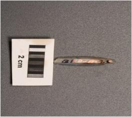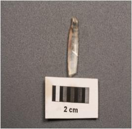 | Description / विवरण | Chalcedony parallel sided blade with a double ridge, diffused bulb, trapezoidal section, used wear marks on cutting edges. |