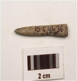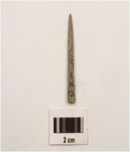 | Description / विवरण | A bone point smooth surface, brown in colour, pointed one end and another end broken. |
