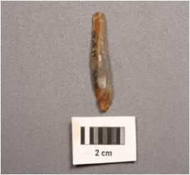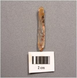 | Description / विवरण | Chalcedony parallel sided blade with ridges, used wear marks on cutting edges, bulb on surface. |