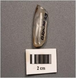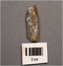 | Description / विवरण | Chalcedony parallel sided blade with a double ridge, used wear marks on one side cutting edge. |