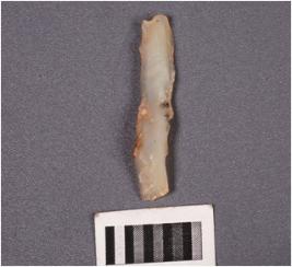 | Description / विवरण | A parallel sided microlithic blade made on chalcedony with a ridge on the dorsal side, prepared platform with positive bulb on the ventral side, irregular cutting edges, triangular in section. |