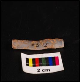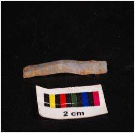 | Description / विवरण | Parallel sided blade with two lateral, sharp, straight cutting edge, flake scars on dorsal surface, concave vertral surface, broken from both proximal & distal end. |