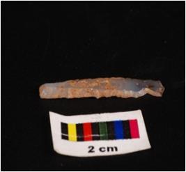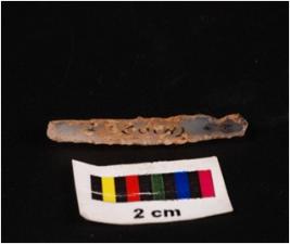 | Description / विवरण | Parallel sided blade, with two parallel teeth like shapr working edge with use were marks, flake scars on dorsal surface, concave ventral surface, both the ends are broken thin at distal end. |