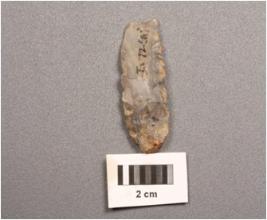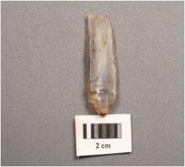 | Description / विवरण | A core made on chalcedony with four blade scars, used wear marks on cutting edges. |