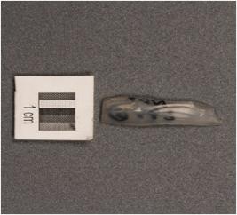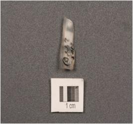 | Description / विवरण | Chalcedony parallel sided blade with a single mid ridge, triangular section, used wear mark on cutting edges. |