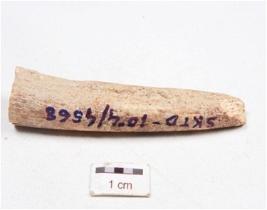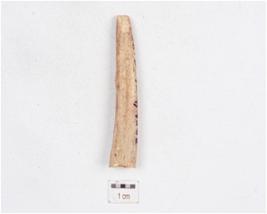 | Description / विवरण | Fragment of a point made on bone, pointed one end, broad other end, circular in section, broken along both the ends, polished surface and vertical groove on one side. |