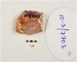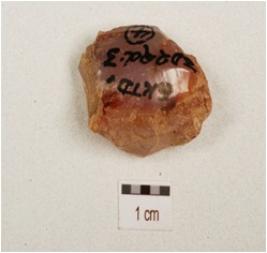 | Description / विवरण | A core made of chalcedony with five blade scars on surface and prepared platform. |