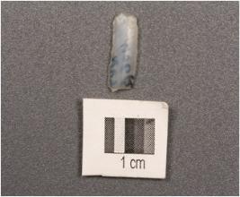 | Description / विवरण | A chalcedony parallel sided blade with a double ridge, trapezoidal section, used wear mark on cutting edges, distal end broken. |